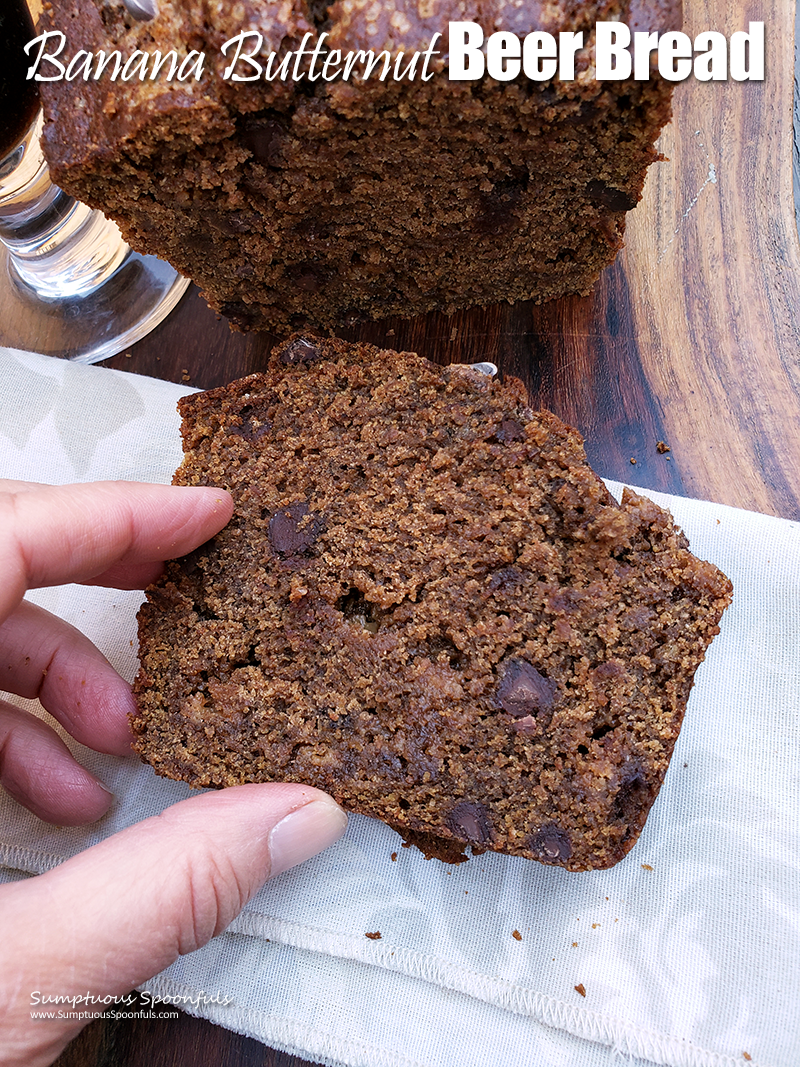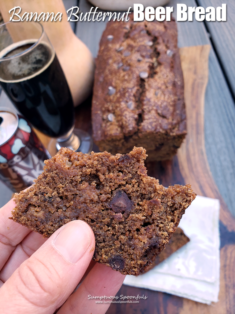 I set out to make Stout Banana Bread, but it kind of accidentally turned into Banana Butternut Beer Bread. The result was a perfectly moist, tender sweet bread with a marvelously complex flavor profile. The malty chocolate stout beer I used gave the bread a nice chocolate flavor even though the recipe calls for just a hint of cocoa powder. The butternut and banana interplay so nicely together, supporting but not overwhelming each other. There’s a bit of peanut butter in there as well. And then the chocolate and butterscotch chips give it that childish fun factor. It’s a “grown up” sweet bread that the kids will absolutely adore as well.