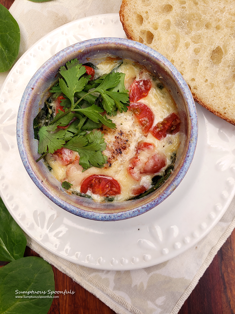 - Make a dent in the middle of the spinach so it’s piled more around the ramekin than in the middle. Sprinkle half of the cheese on, then add the milk or cream. Crack the egg into the center. Sprinkle with bacon salt (or salt) and pepper, then top with the rest of the cheese and the chopped tomato.