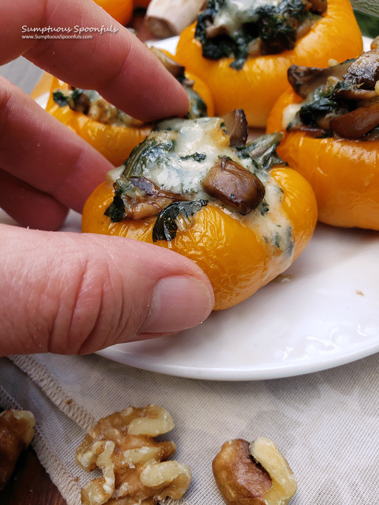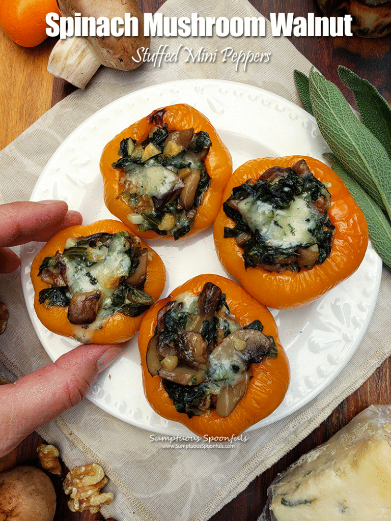 Spinach, mushrooms and walnuts stuffed into mini sweet peppers with tangy blue cheese, herbs and garlic make a delightful little bite!