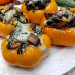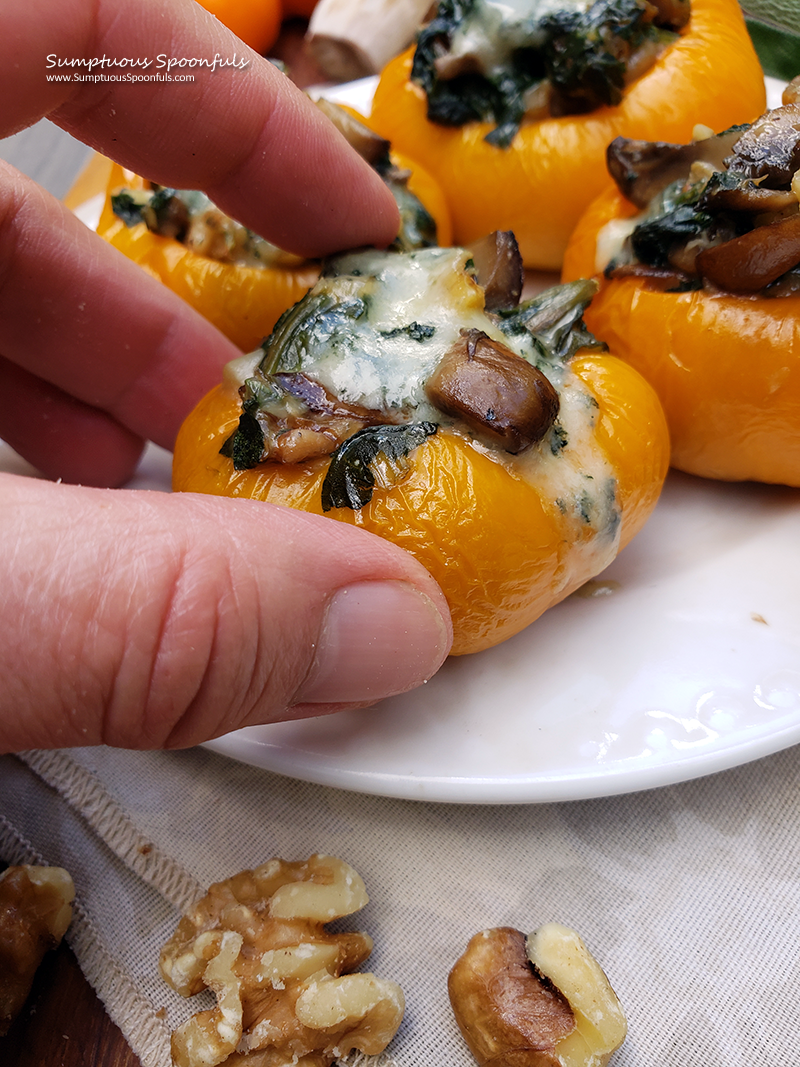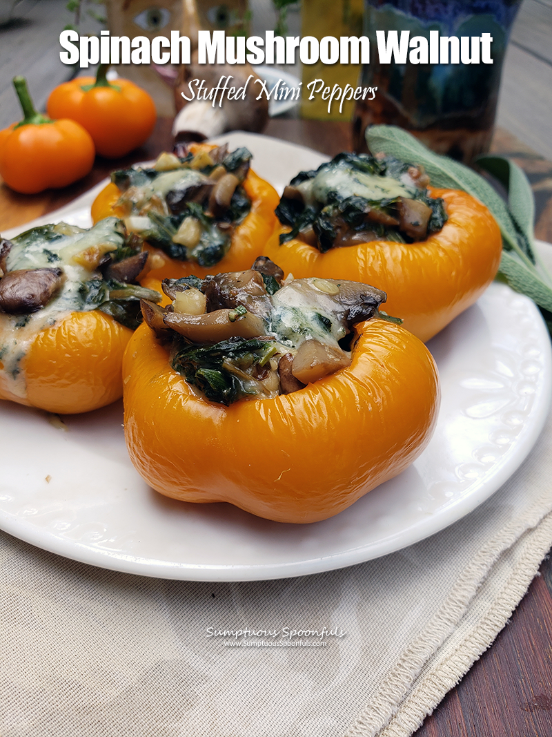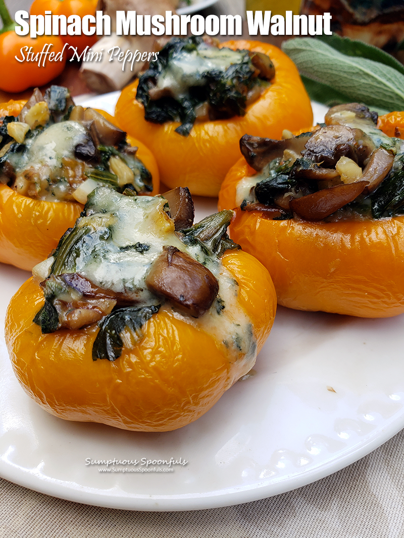 Spinach, mushrooms and walnuts stuffed into mini sweet peppers with tangy blue cheese, herbs and garlic make a delightful little bite!