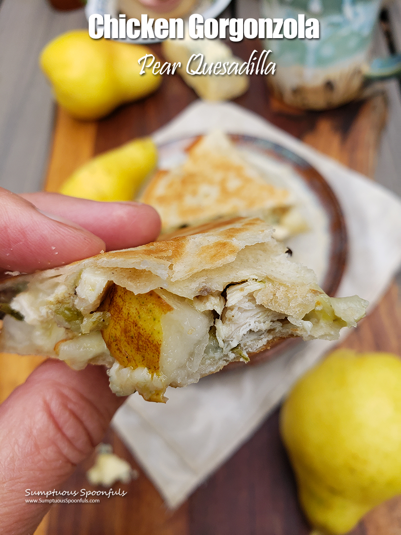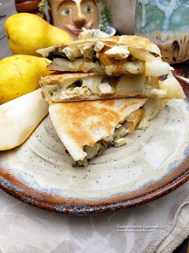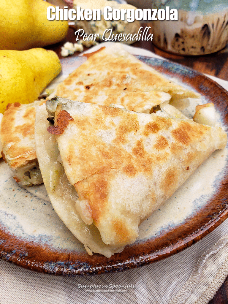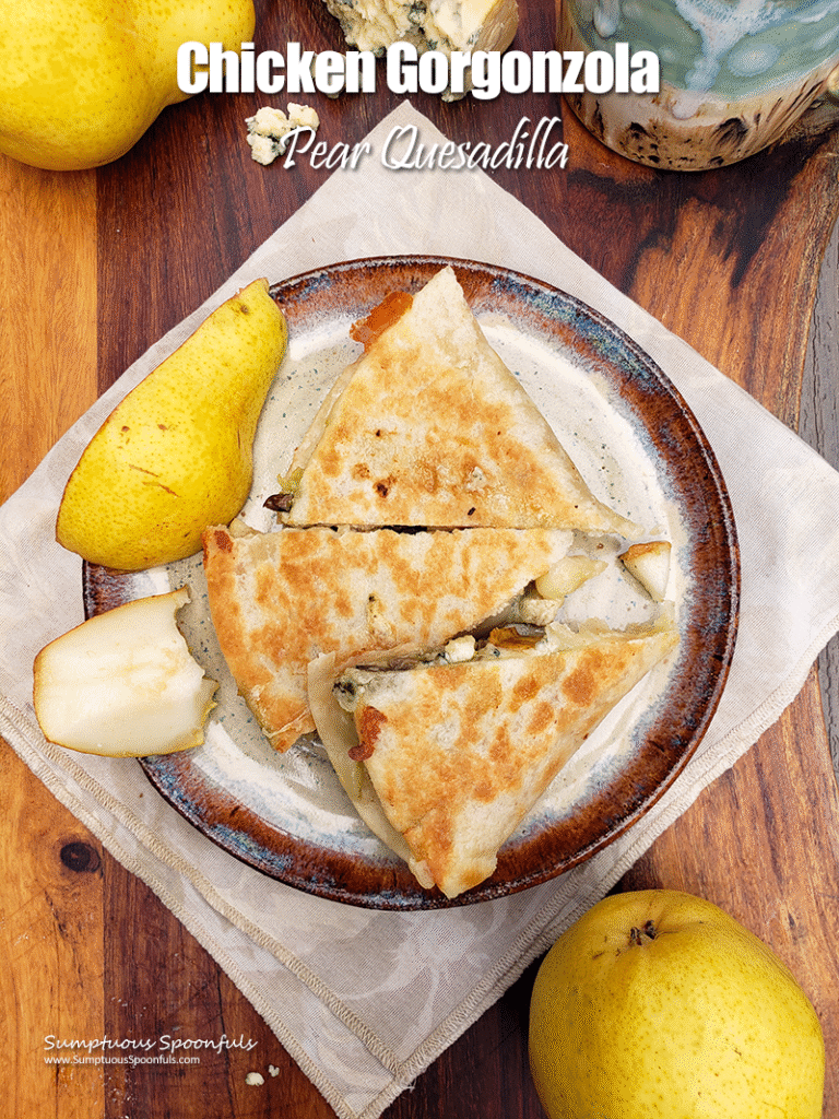 Savory chicken, tangy gorgonzola cheese, melty queso quesadilla cheese and juicy sweet pears enveloped in a golden brown crunchy tortilla crust, this simple quesadilla is anything but ordinary. Using leftover chicken, it takes just minutes to prepare and the flavors seriously blew me away. If you’ve never had pears with blue cheese, you are in for a treat.