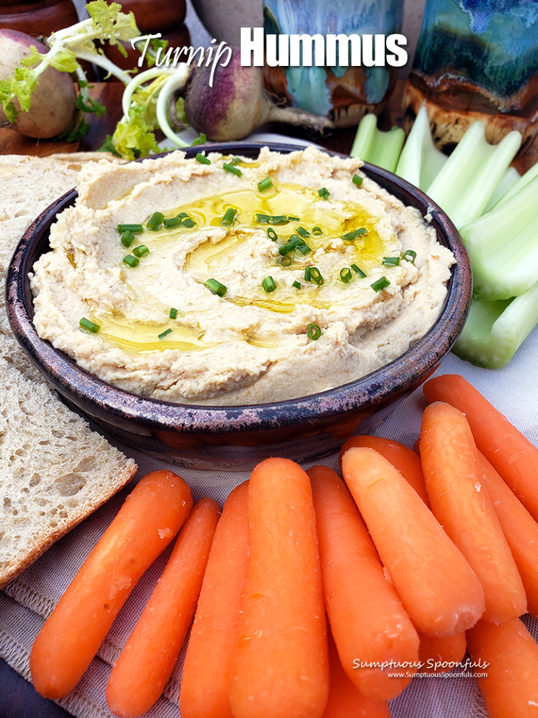 Roasting turnips until soft and tender gives this creamy turnip hummus a hint of earthy sweetness. Roasting most of the garlic softens and sweetens the garlic flavor too, with a bit of fresh garlic blended in at the end to give it just a little garlicky bite. Chickpeas, fresh lemon juice, olive oil and tahini round it all out for a hummus that’s just delightful for dipping. Even though I was making this dip early in the morning, I didn’t want to stop taste testing it!