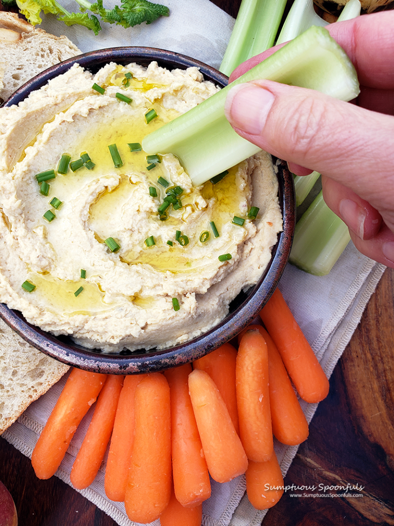 - Blend until very smooth, adding the reserved liquid from the can of beans bit by bit until the hummus blends nice and smooth. Spoon into a bowl, garnish with a drizzle of olive oil and chives or fresh parsley leaves and serve with your choice of dippers. Store leftovers in a covered container in the fridge.