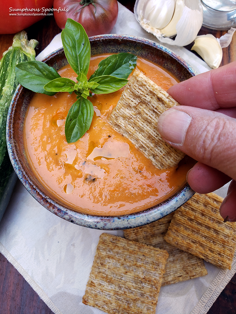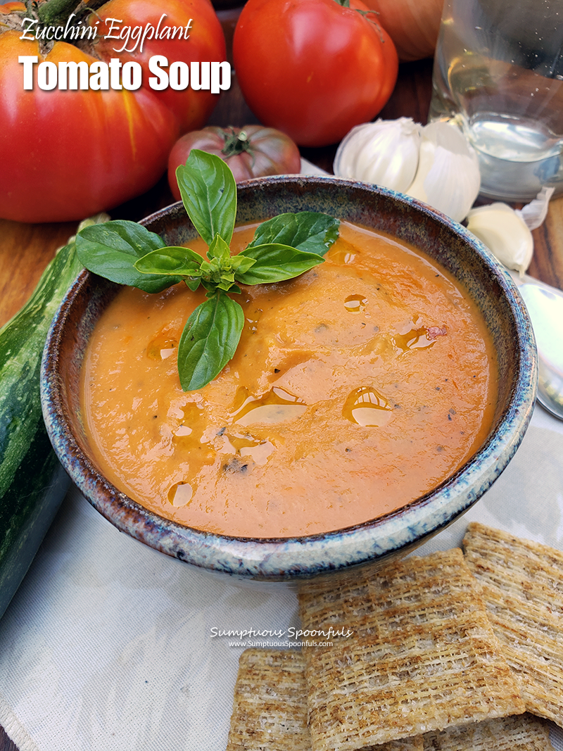 A marvelous, creamy tomato soup with fresh herbs and extra veggies and nutrients hiding in the background. This zucchini eggplant tomato soup will quickly become a favorite.