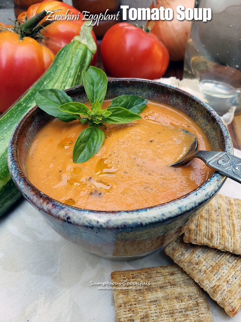This marvelous creamy Zucchini Eggplant Tomato Soup is a breeze to whip up and a pleasure to eat! It feels like eating a bowl of gourmet tomato soup, but there are extra veggies hiding inside. When I say “gourmet” tomato soup, I mean the kind you might order at a fancy restaurant. Where they use the really good tomatoes with fancy cheeses and fresh herbs. If you’ve never had THAT kind of made-from-scratch tomato soup, you’re about to up your game. You may never want canned tomato soup again.